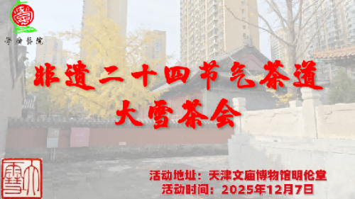 “月是小春春未生,节名大雪雪何曾。”大雪,是二十四节气中的第21个节气,冬季的第3个节气,斗指壬,太阳到达黄经255°,交节时间为每年公历12月6-8日。大雪节气标志着仲冬时节正式开始,节气特点是气温显著下降,强冷空气往往能够带来雨或雪。2025年12月7日,正值大雪节气,为弘扬中华优秀传统文化,加强非物质文化遗产活态传承,天津文庙博物馆携手学广艺院(天津)培训学校,共同举办了“非遗二十四节气——大雪茶会”。